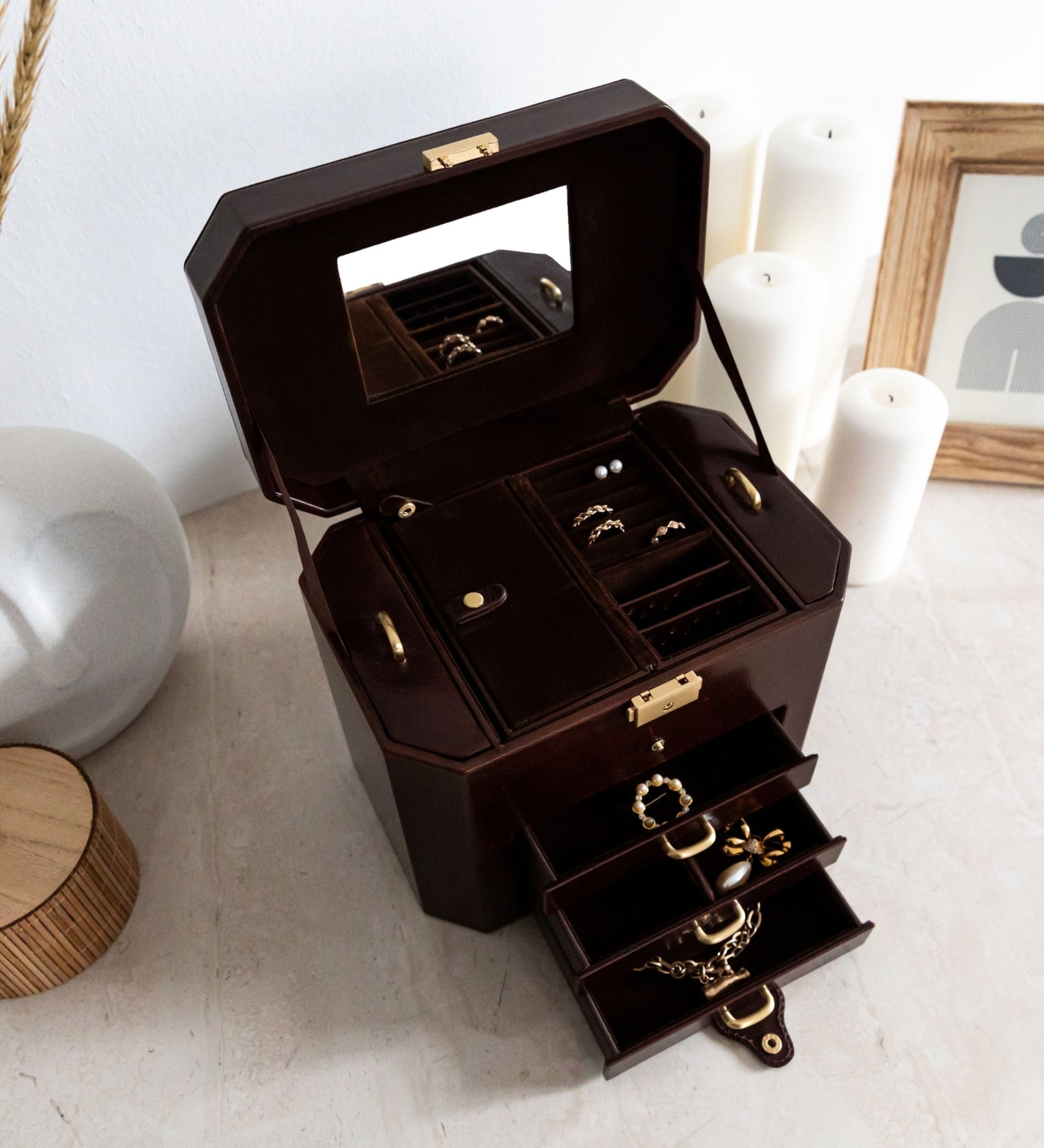 I bought a dark blue, large leather jewelry box for Christmas and I love it. Infact I was so pleased with it that I decided to buy a second one in another colour for a different bedroom but, sadly, there were no more on line. I am hoping they will come back in the new year. I can thoroughly recommend it. Very good quality item.