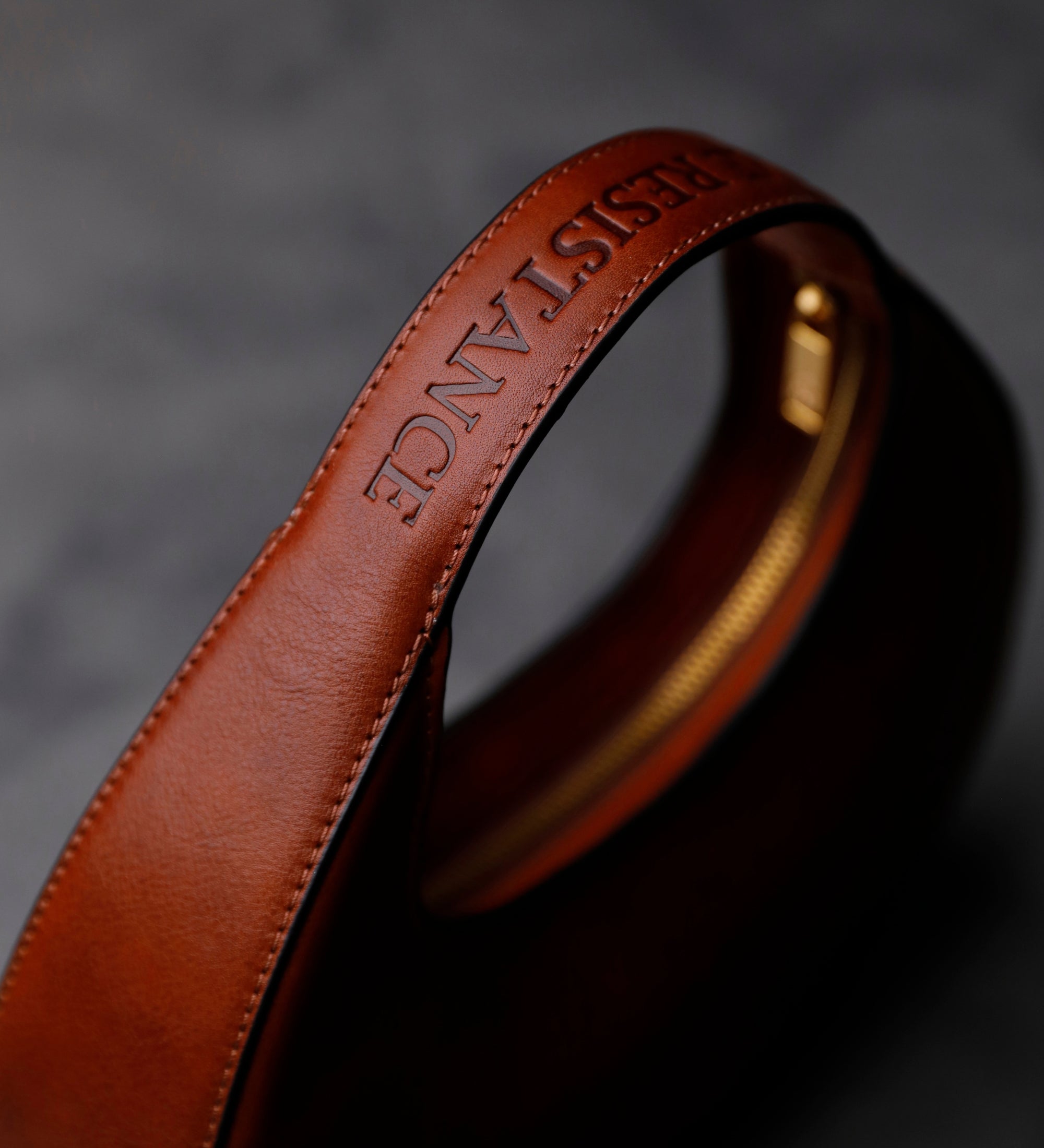 Introducing "The Moonstone" leather handbag, a celestial-inspired accessory that captures the essence of timeless elegance. Crafted with precision, its small, rounded shape evokes tranquil beauty, while the round handle adds a touch of grace. Designed to be cradled in your arm with its compact size, it exudes an aura of effortless sophistication. The zip closure ensures your belongings are securely tucked away, while the sleek minimal design speaks volumes of refined taste. Adorned with the Time Resistance logo on the handle, it's a symbol of quality craftsmanship and enduring style. Illuminate your ensemble with "The" Handbag—an embodiment of celestial allure and understated refinement.