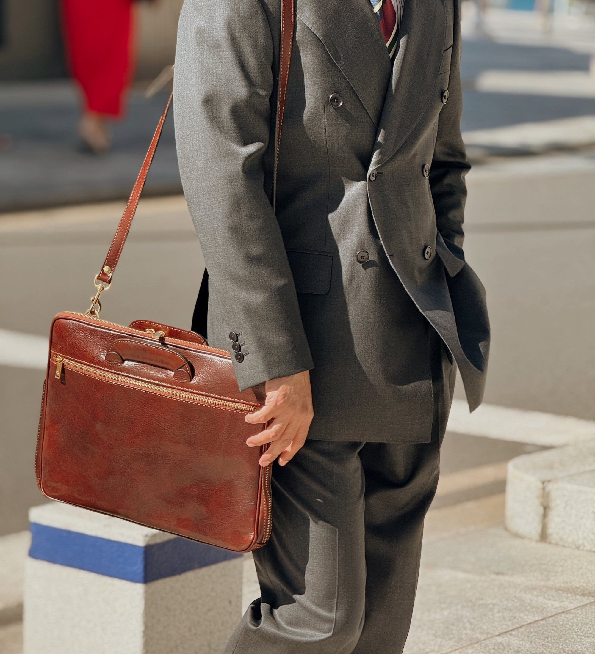 A full-grain leather briefcase that expresses perfect harmony between hard and soft. Top quality hand-dyed leather gives a sentimental feel, but the lines convey a light touch of modern. Timeless and current. Manly and feminine. Urban practicality with charisma.