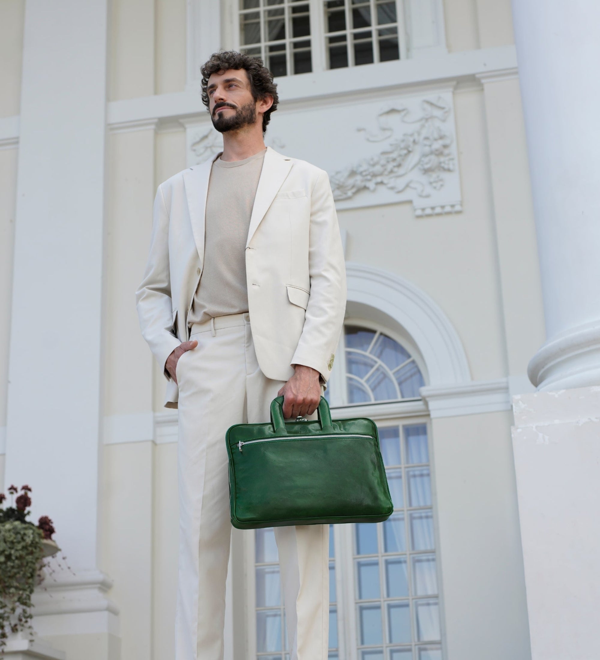 A full-grain leather briefcase that expresses perfect harmony between hard and soft. Top quality hand-dyed leather gives a sentimental feel, but the lines convey a light touch of modern. Timeless and current. Manly and feminine. Urban practicality with charisma.