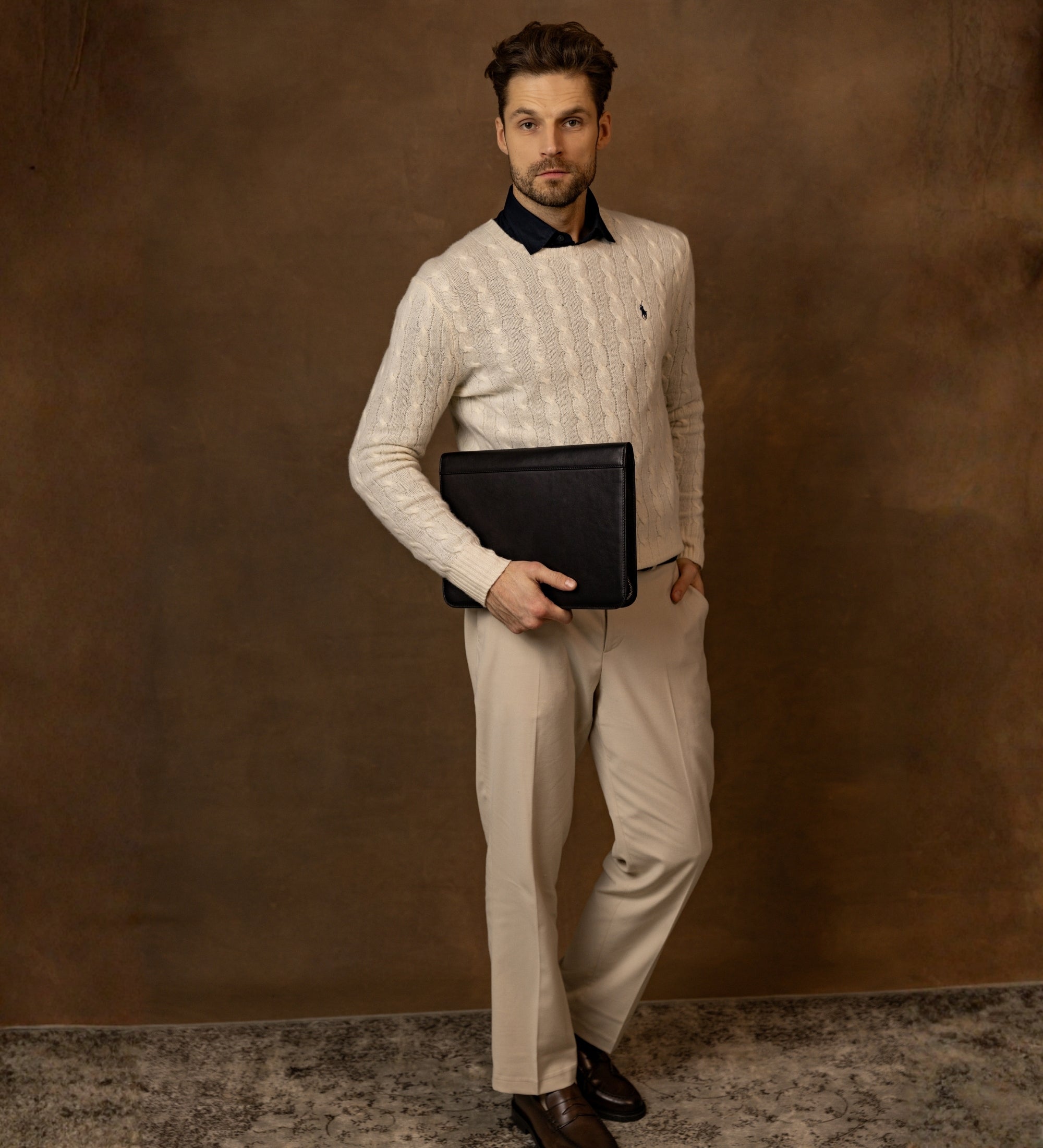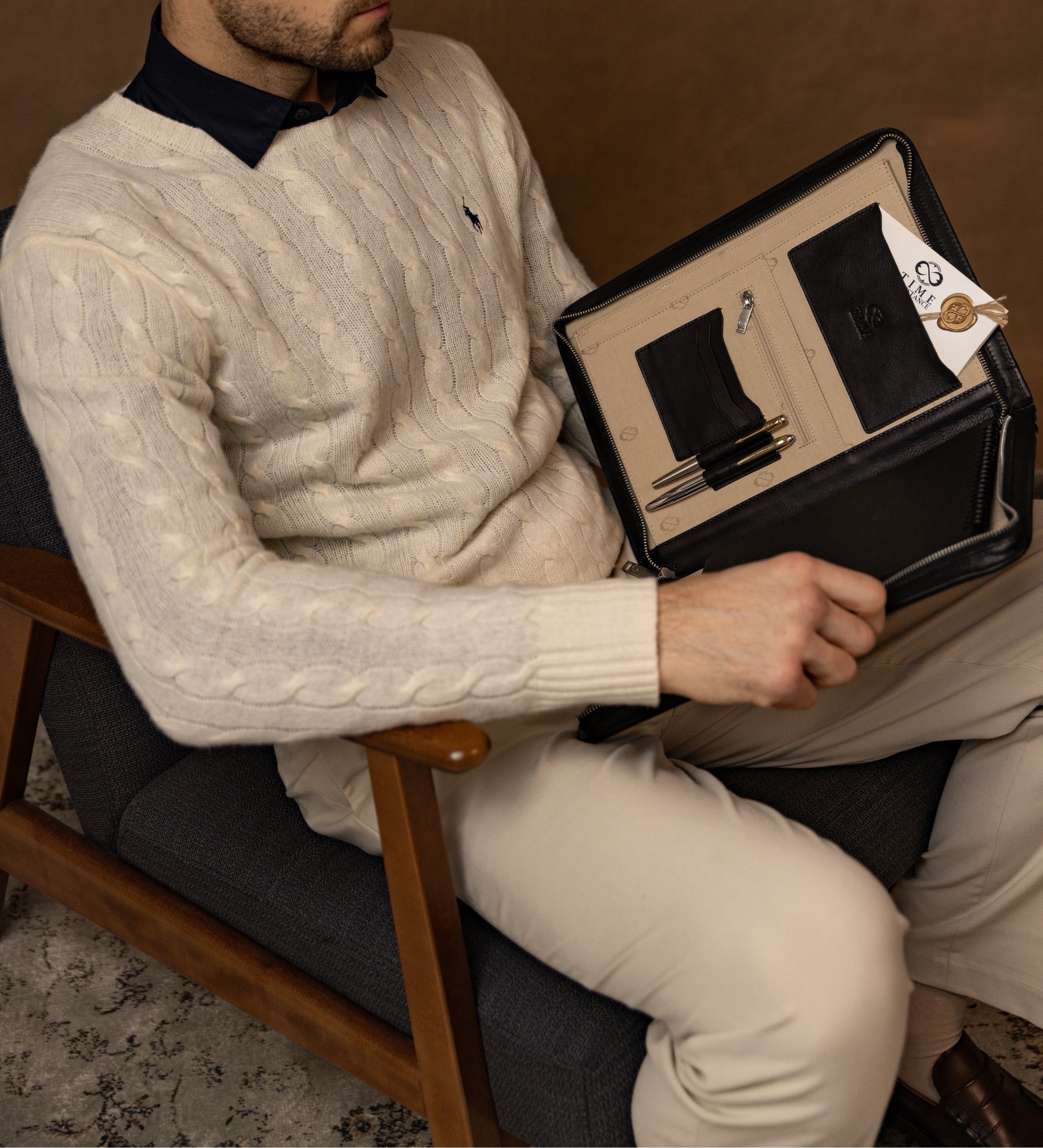 A solid full-grain leather documents folder that will complete a sleek minimalist business look. To organize your files and digital devices but keep a light, effortless chic appearance.