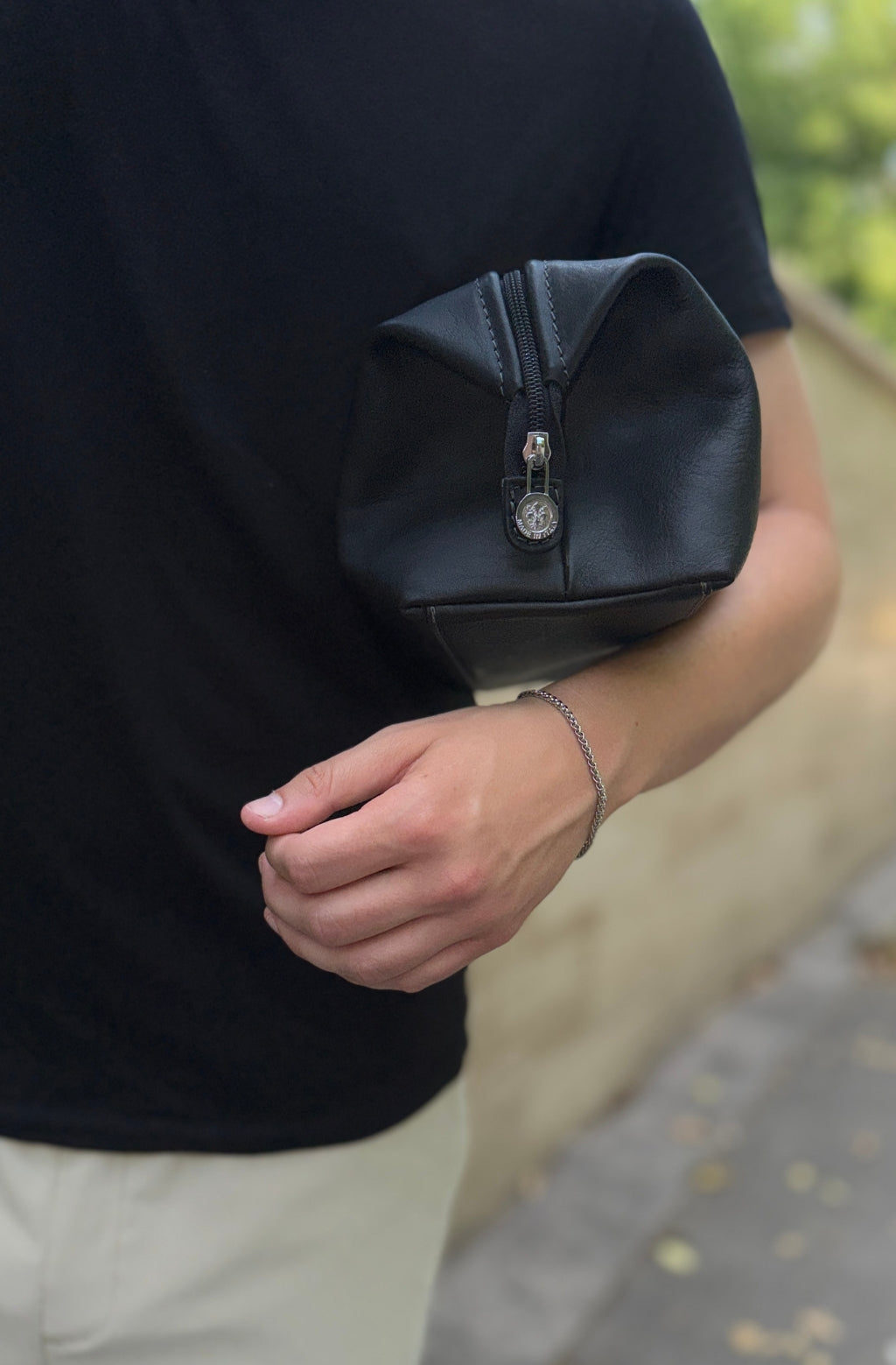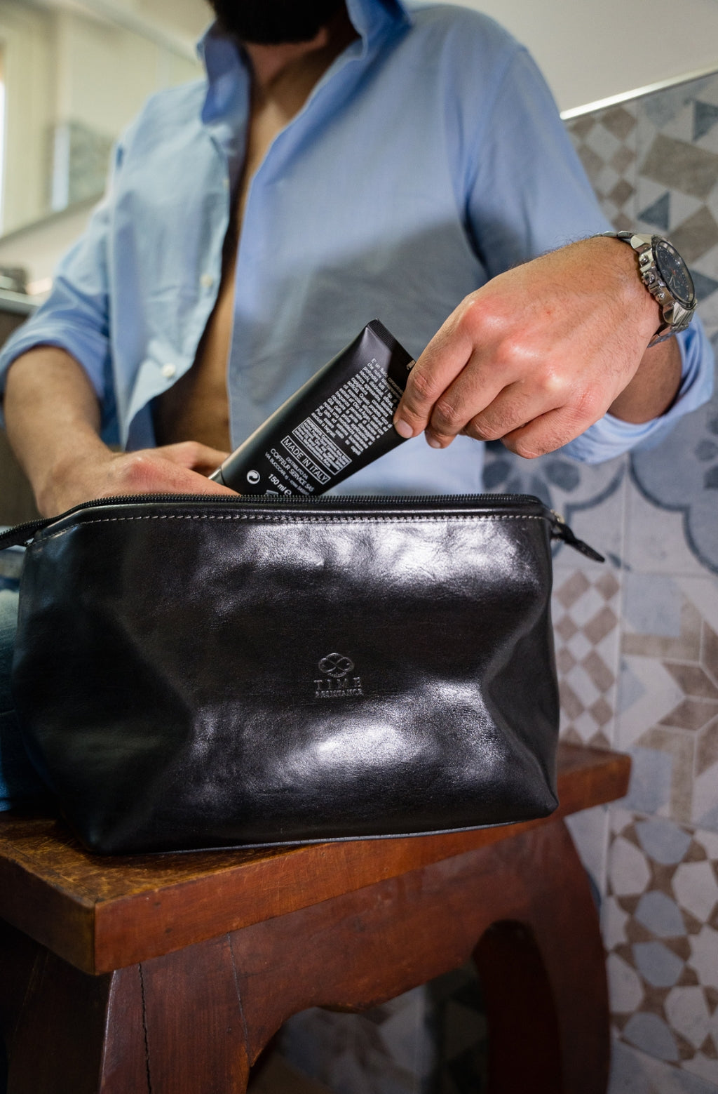 A full-grain leather wash bag is roomy enough to fit all your daily necessities with an inside pocket and a frame that allows for full opening for convenient access.