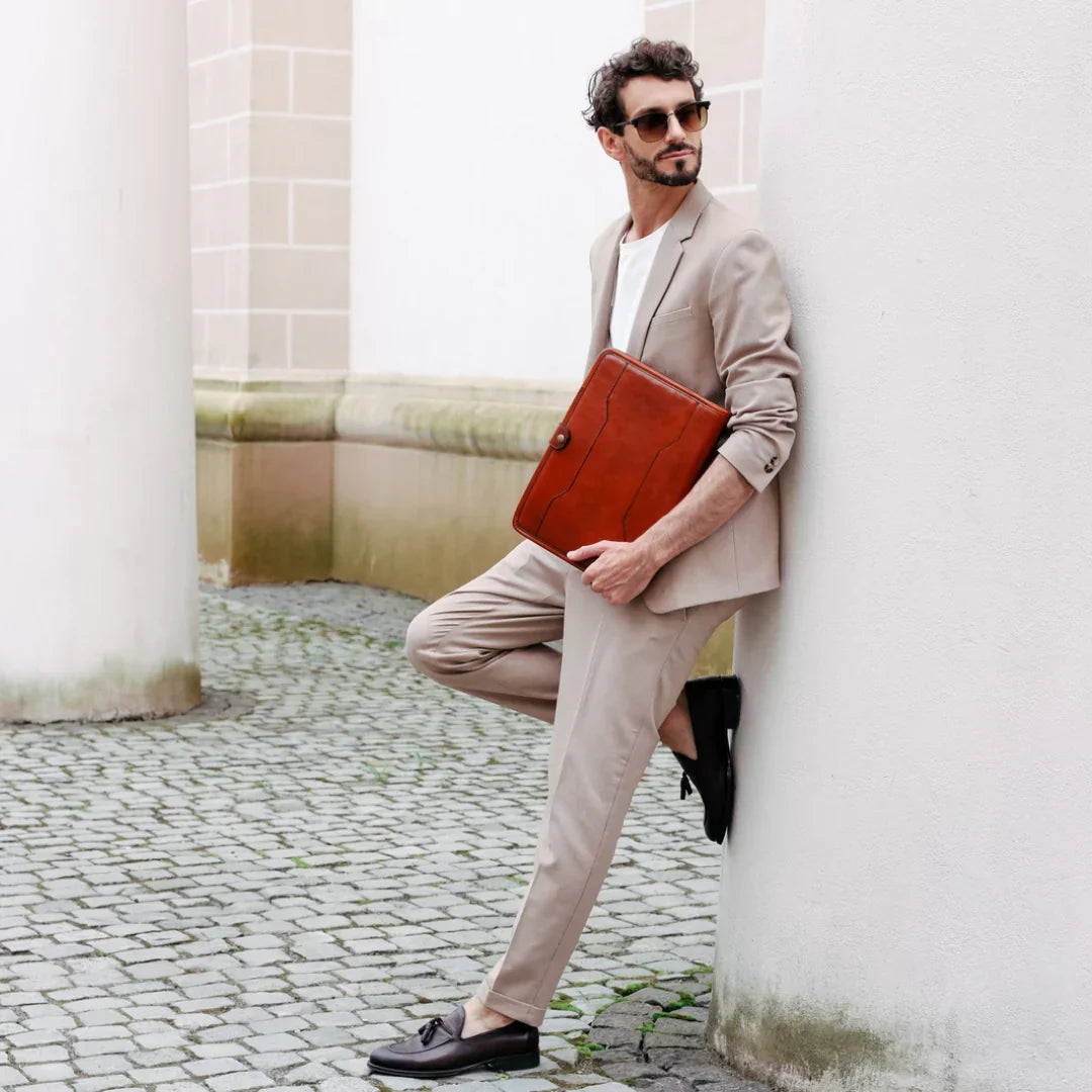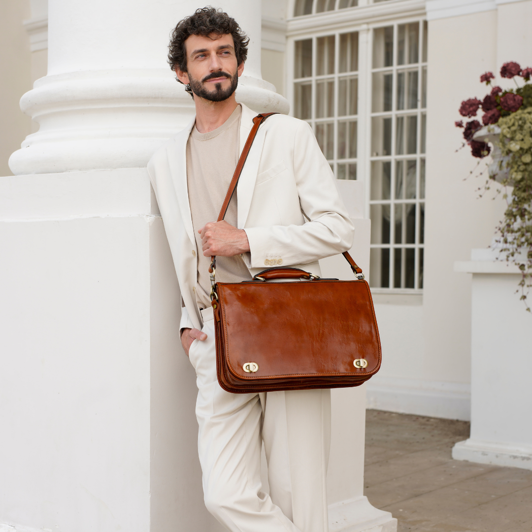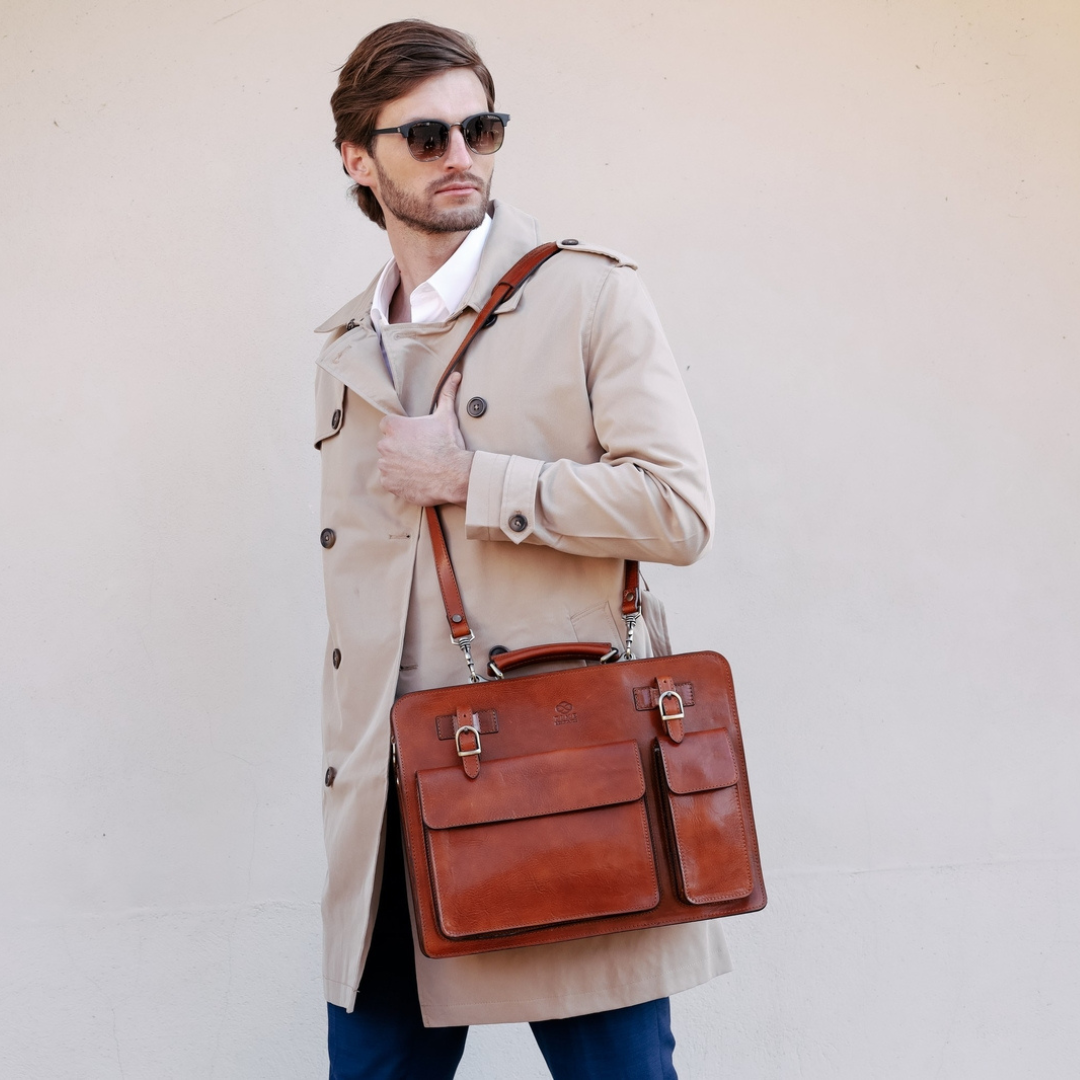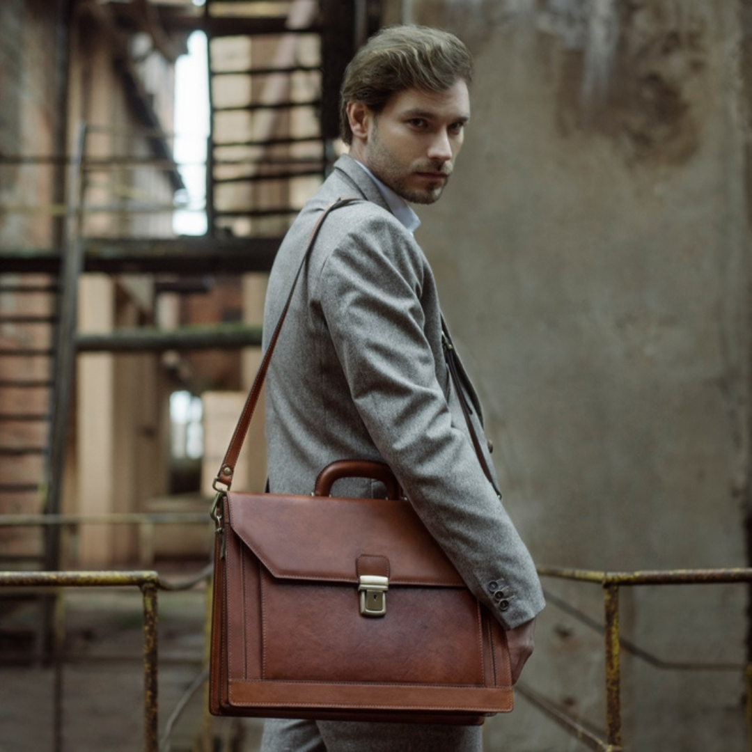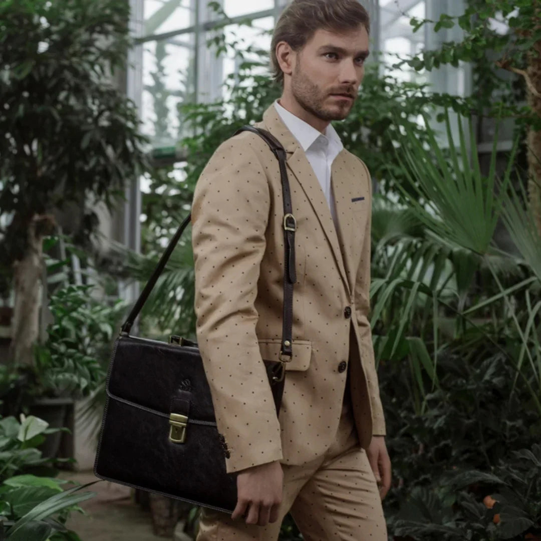 This spring, we invite you to experience a new kind of love: a love between you and your bag. Our latest photoshoot is a tribute to this special bond that transcends time and space. Our leather bags are more than just accessories. They are companions, confidants, and soulmates. They reflect your inner beauty and express your outer style. They are with you through thick and thin, through joy and sorrow, through work and play. They are the ones who make you feel alive and complete. Our photoshoot captures the magic of spring: the freshness of the air, the warmth of the sun, the vibrancy of the city. The model is a vision of elegance and charm, wearing a suit that matches his bags and his mood. The background is a stunning contrast of light and dark, with subtle touches of modernity and history. The photoshoot is a romance between you and your bag. It shows that you don’t need anyone else to make you happy. You just need yourself and your bag. So go ahead and indulge in a spring fling with our leather bags.