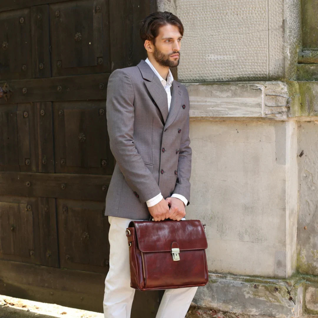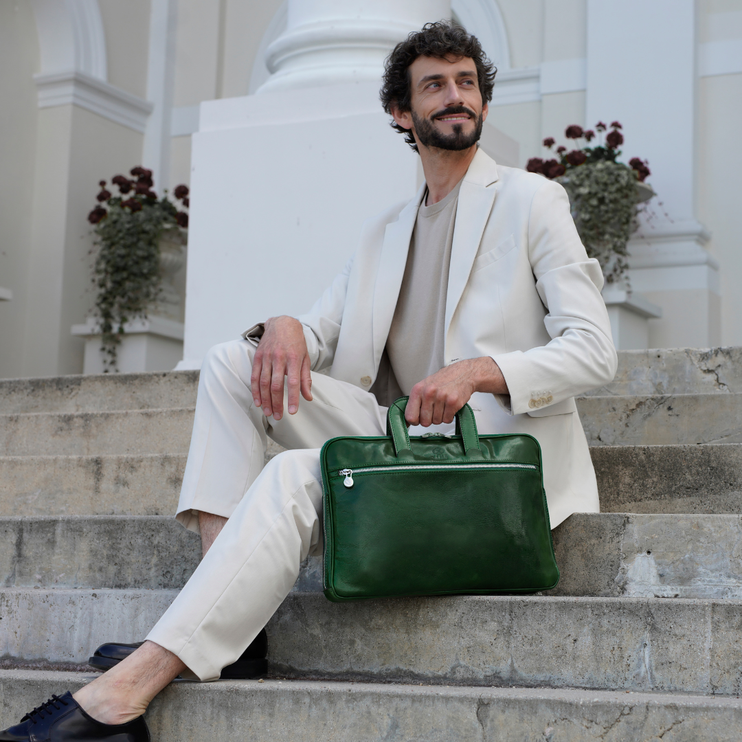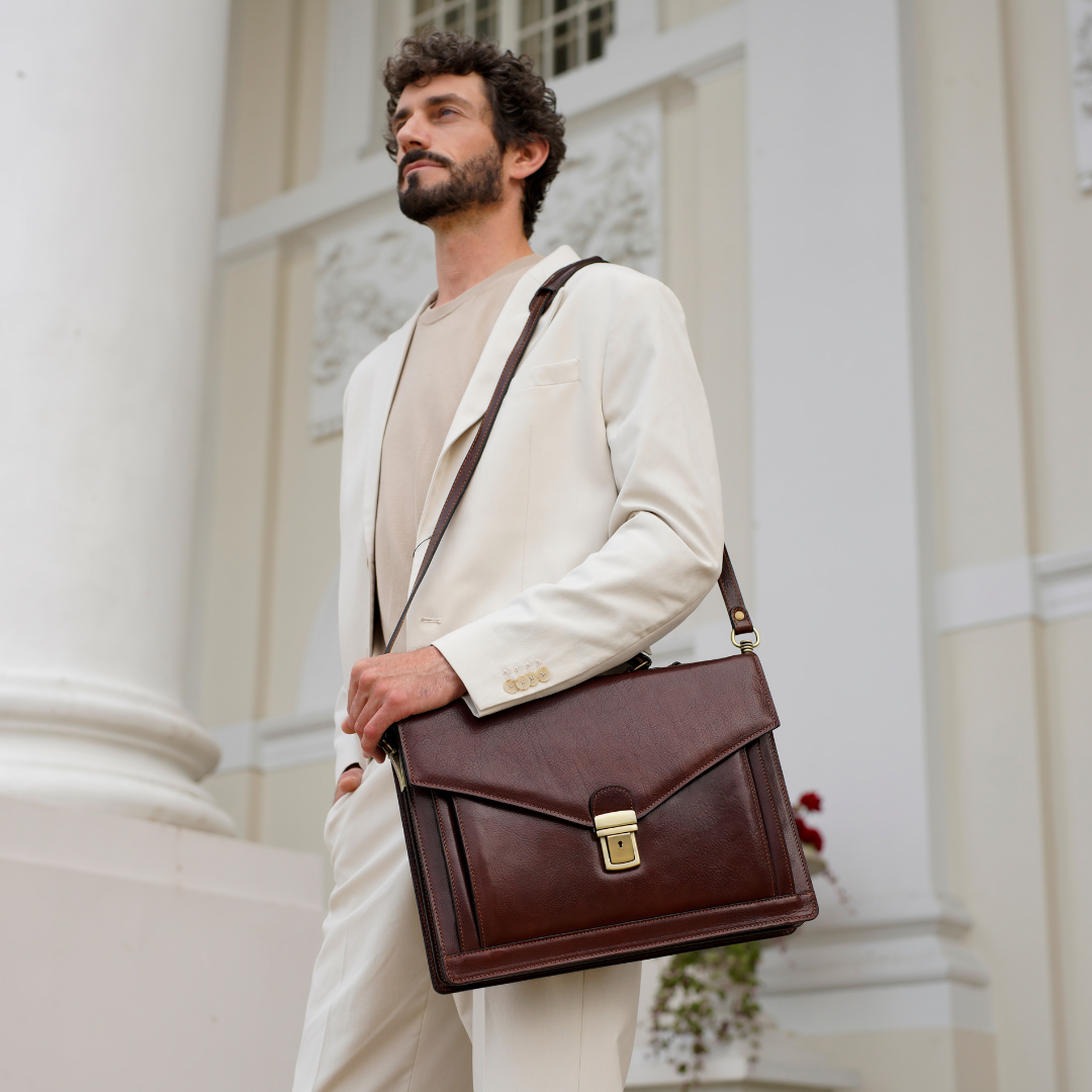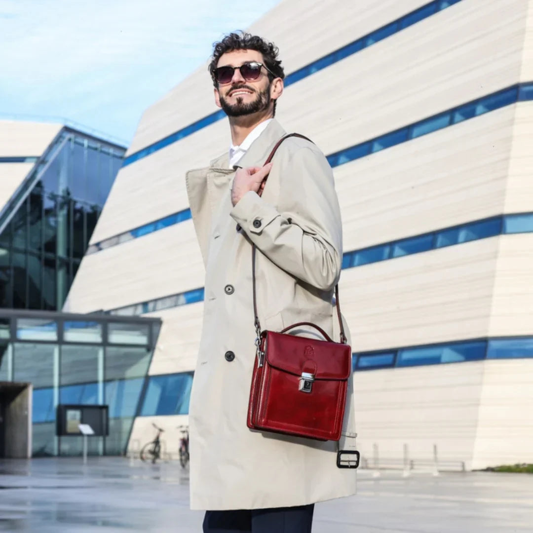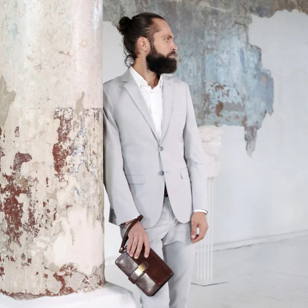 This spring, we invite you to experience a new kind of love: a love between you and your bag. Our latest photoshoot is a tribute to this special bond that transcends time and space. Our leather bags are more than just accessories. They are companions, confidants, and soulmates. They reflect your inner beauty and express your outer style. They are with you through thick and thin, through joy and sorrow, through work and play. They are the ones who make you feel alive and complete. Our photoshoot captures the magic of spring: the freshness of the air, the warmth of the sun, the vibrancy of the city. The model is a vision of elegance and charm, wearing a suit that matches his bags and his mood. The background is a stunning contrast of light and dark, with subtle touches of modernity and history. The photoshoot is a romance between you and your bag. It shows that you don’t need anyone else to make you happy. You just need yourself and your bag. So go ahead and indulge in a spring fling with our leather bags.