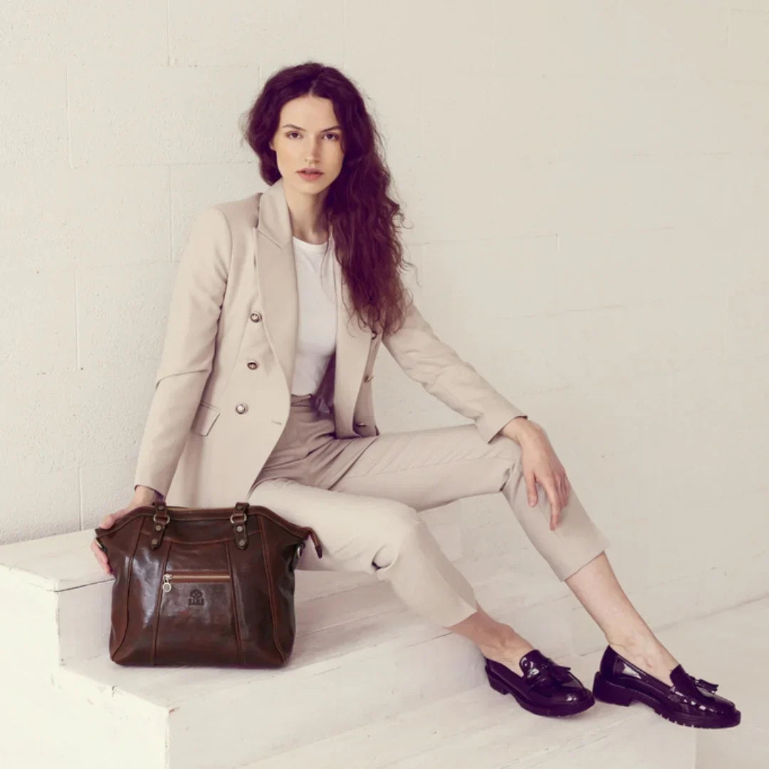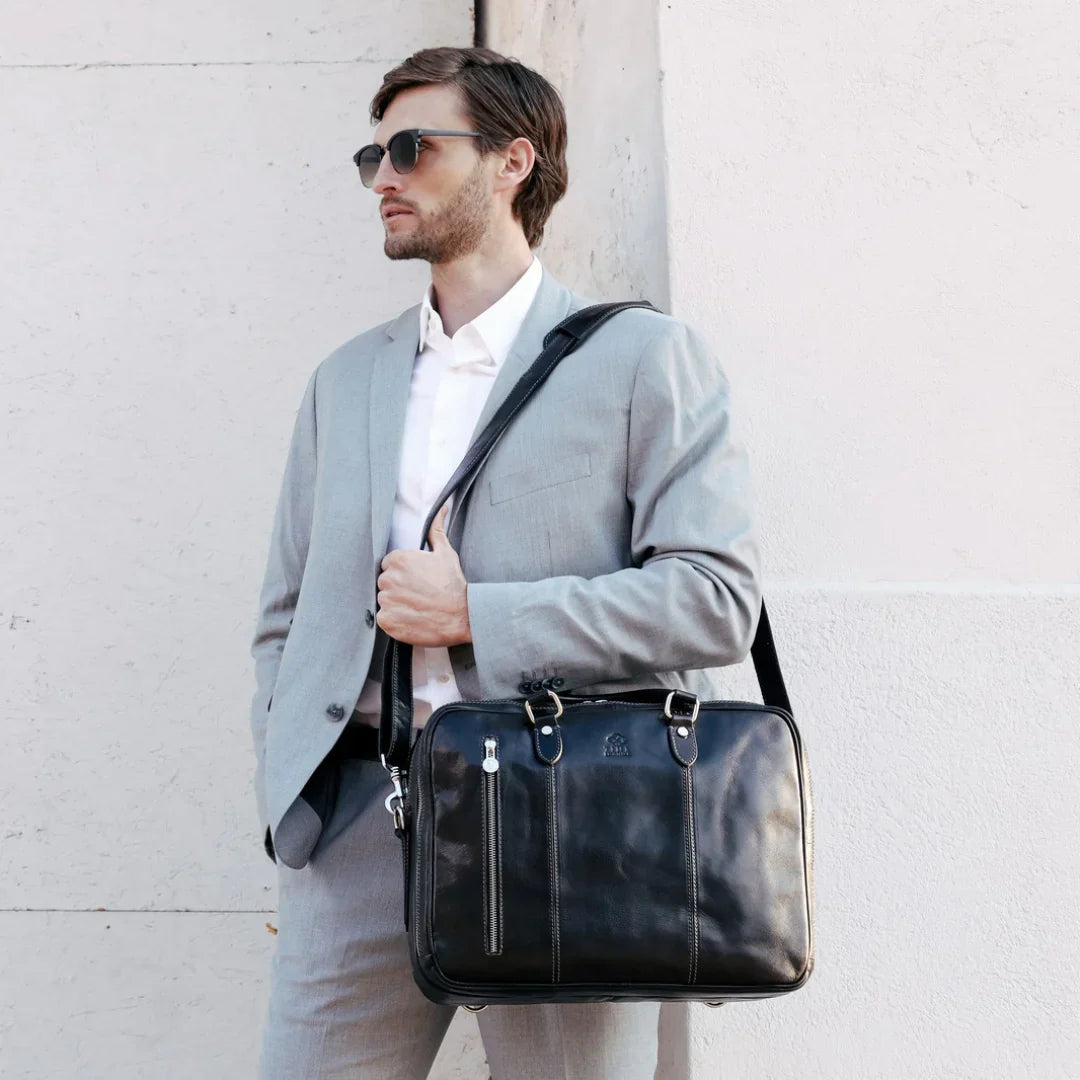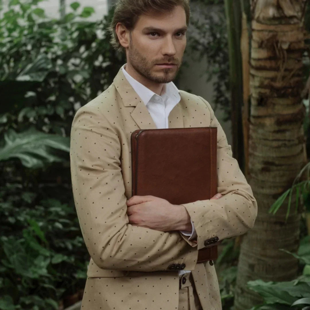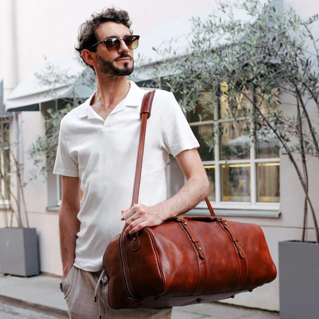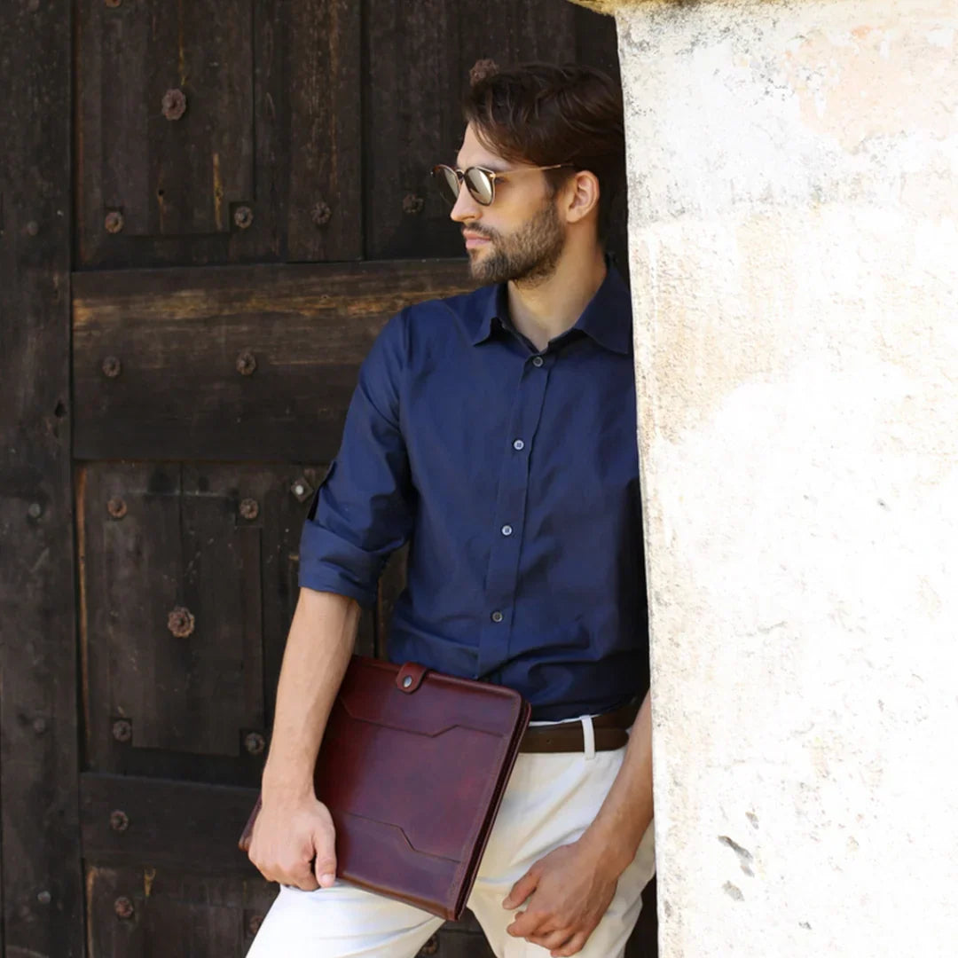 This spring, we invite you to experience a new kind of love: a love between you and your bag. Our latest photoshoot is a tribute to this special bond that transcends time and space. Our leather bags are more than just accessories. They are companions, confidants, and soulmates. They reflect your inner beauty and express your outer style. They are with you through thick and thin, through joy and sorrow, through work and play. They are the ones who make you feel alive and complete. Our photoshoot captures the magic of spring: the freshness of the air, the warmth of the sun, the vibrancy of the city. The model is a vision of elegance and charm, wearing a suit that matches his bags and his mood. The background is a stunning contrast of light and dark, with subtle touches of modernity and history. The photoshoot is a romance between you and your bag. It shows that you don’t need anyone else to make you happy. You just need yourself and your bag. So go ahead and indulge in a spring fling with our leather bags.