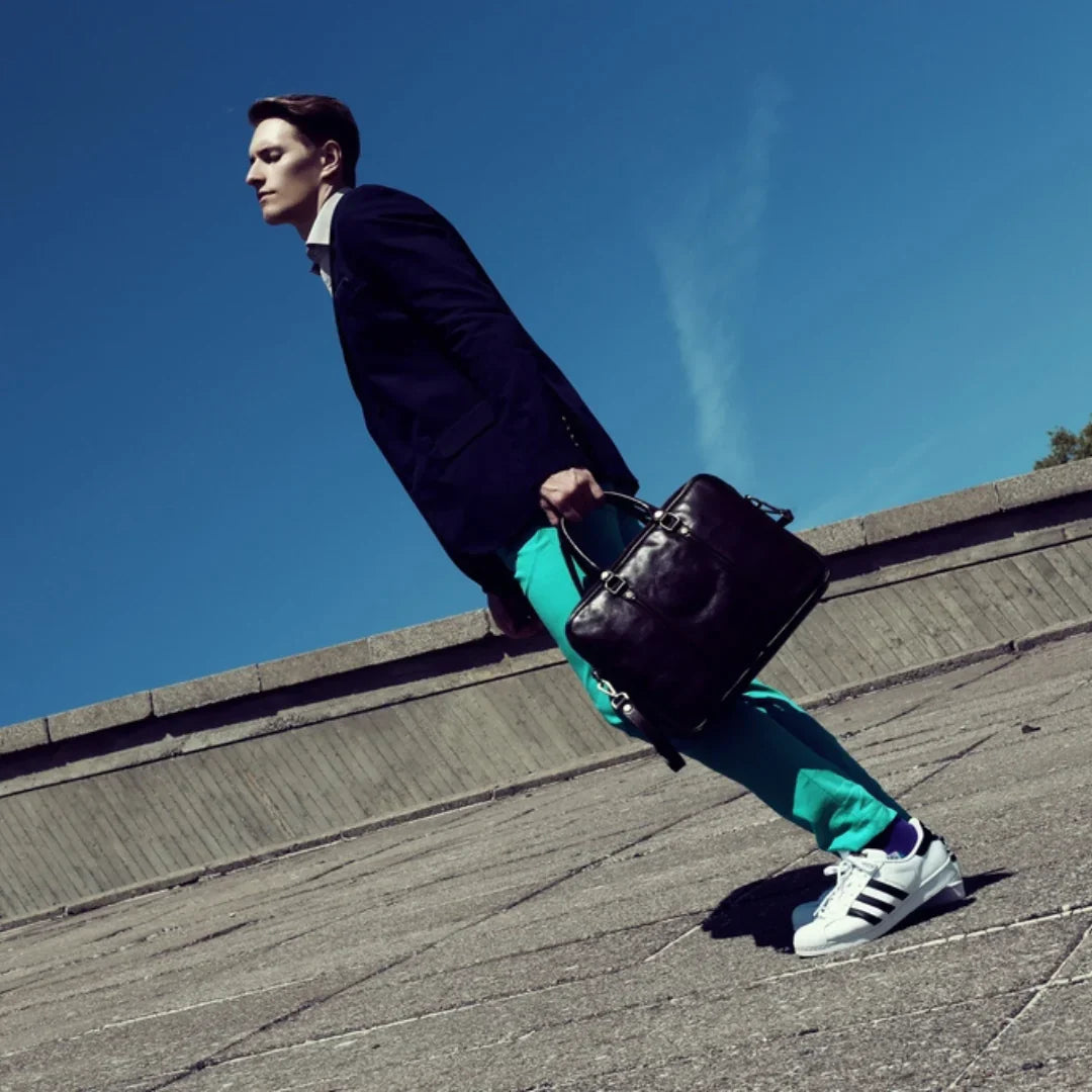 We have always believed that classy leather bags are not for only stuffy business man, cool guys can wear them as well without loosing their swag. This is what we tried to prove with the photoshoot called Opposites Attract. Some shoots were taken in an old manor and the classic design doctor bags really brought us back in time for a moment. Then we moved to a skating park near some office buildings where many young guys like our handsome model actually work. The bags really accustomed to the new habitat and transformed the man into an edgy millennial.