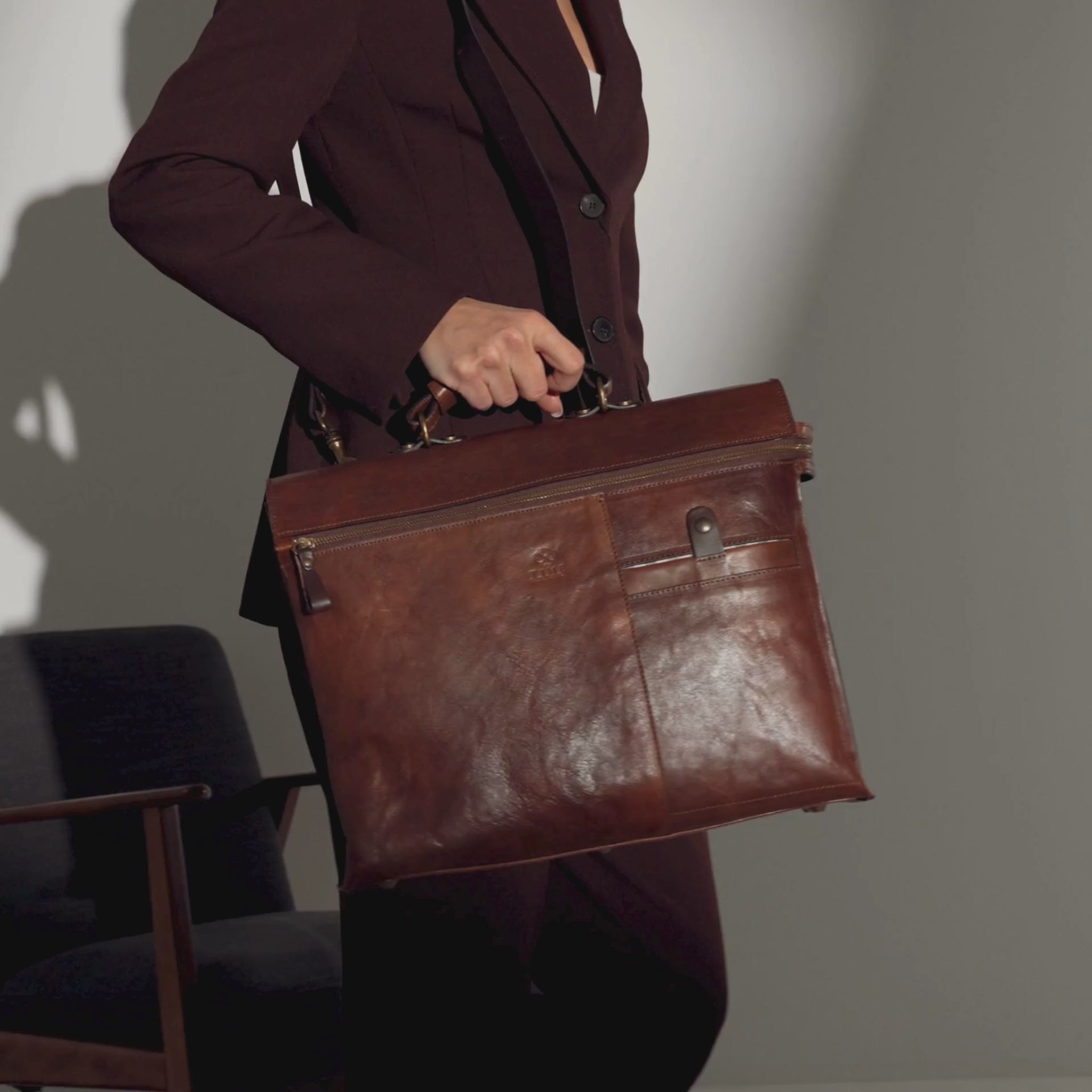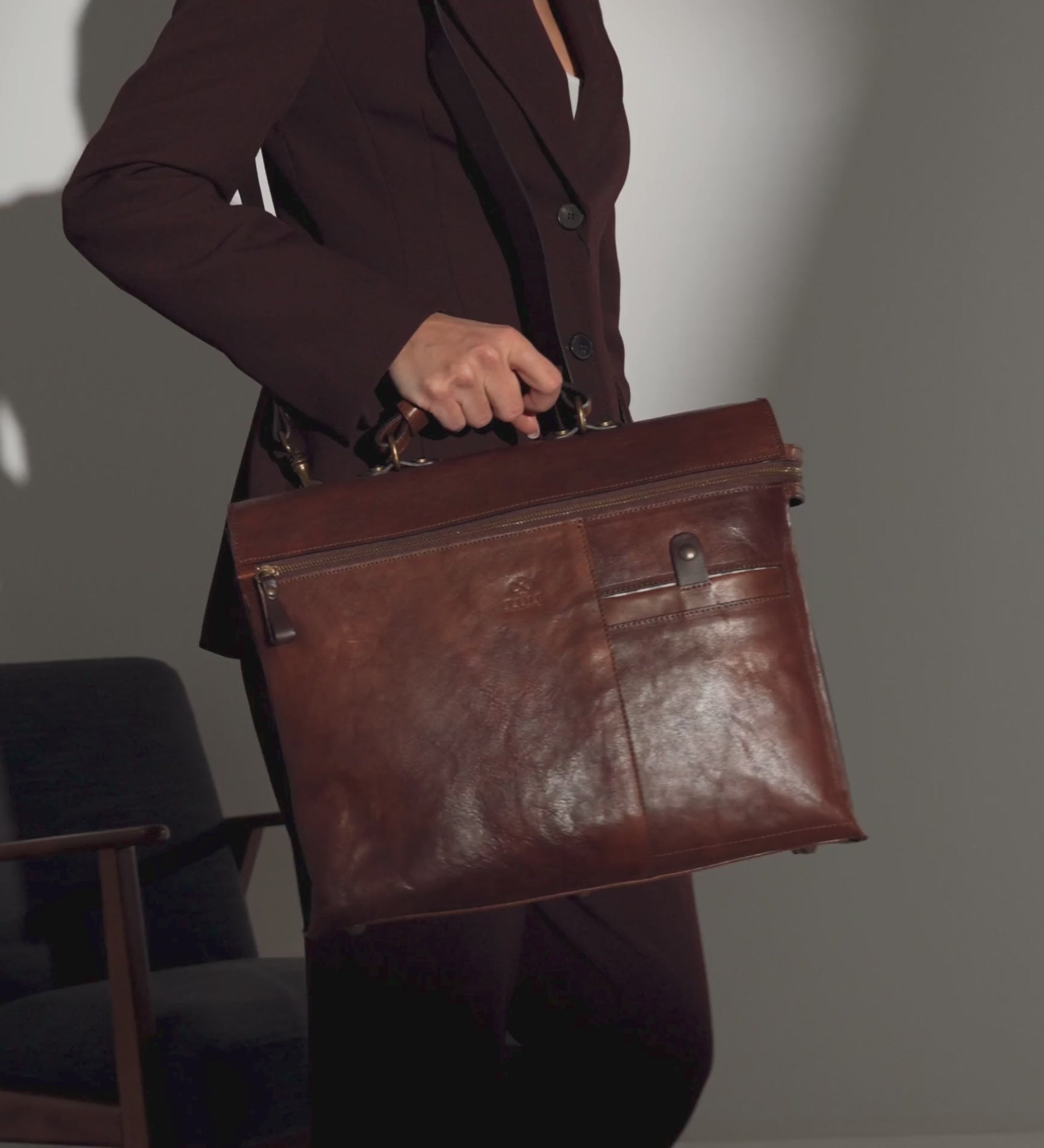 This leather briefcase is the perfect companion for your busy and adventurous life. It’s made from premium leather that ages beautifully with time and use. It has a modern and minimal design that complements your professional and casual outfits. It has enough room for your laptop, documents, and everything else you need for work or play. You can carry it with ease by the handle or the shoulder strap, depending on your mood and outfit. It has a zip closure that keeps your stuff safe and secure, and plenty of pockets inside and outside to keep you organized and ready for anything. One of the outside pockets is specially designed for your smartphone, so you can always stay connected and in touch with the world. This leather briefcase is not just a bag - it’s a partner for your achievements and goals.