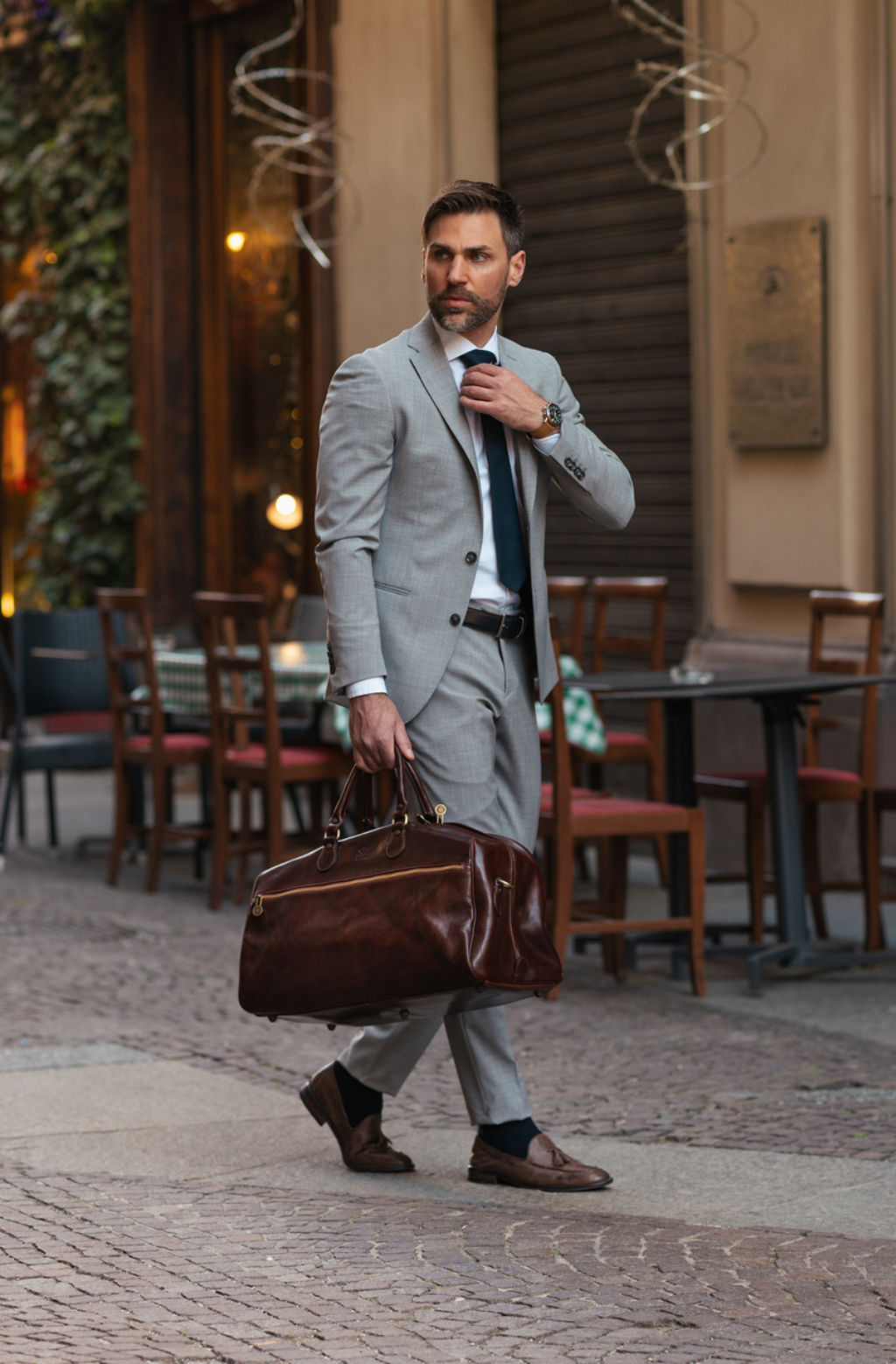 A leather duffel that combines time-tested design and modern life needs. Roomy enough to accompany you on a weekend getaway, short business trip, or to serve as an overnight bag when you’re not sure what the evening will bring.
