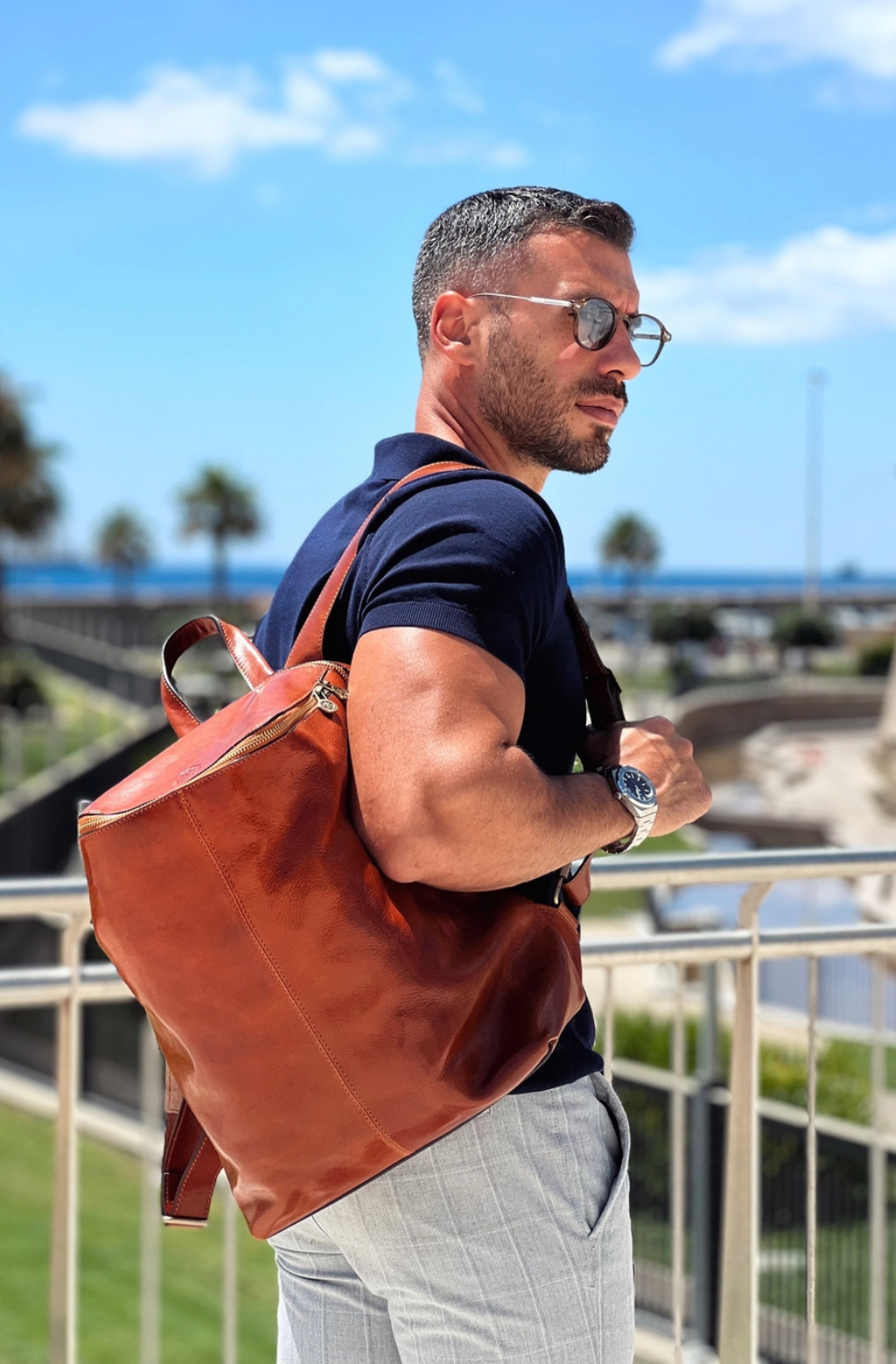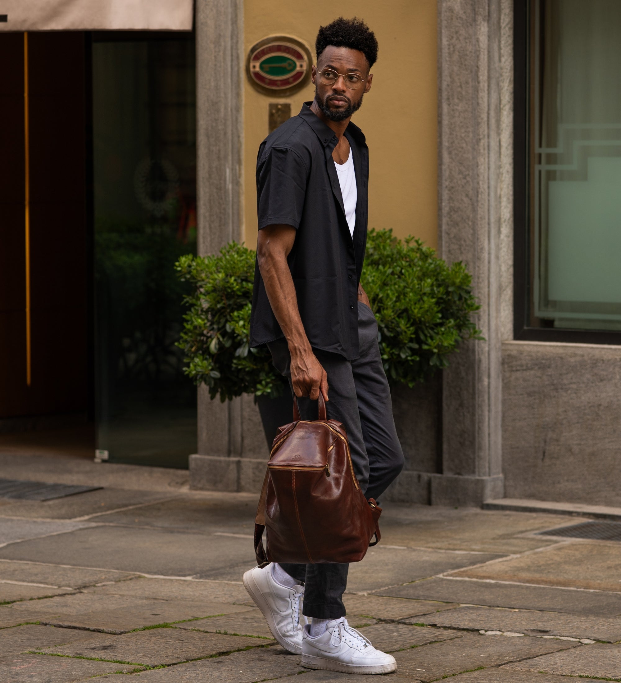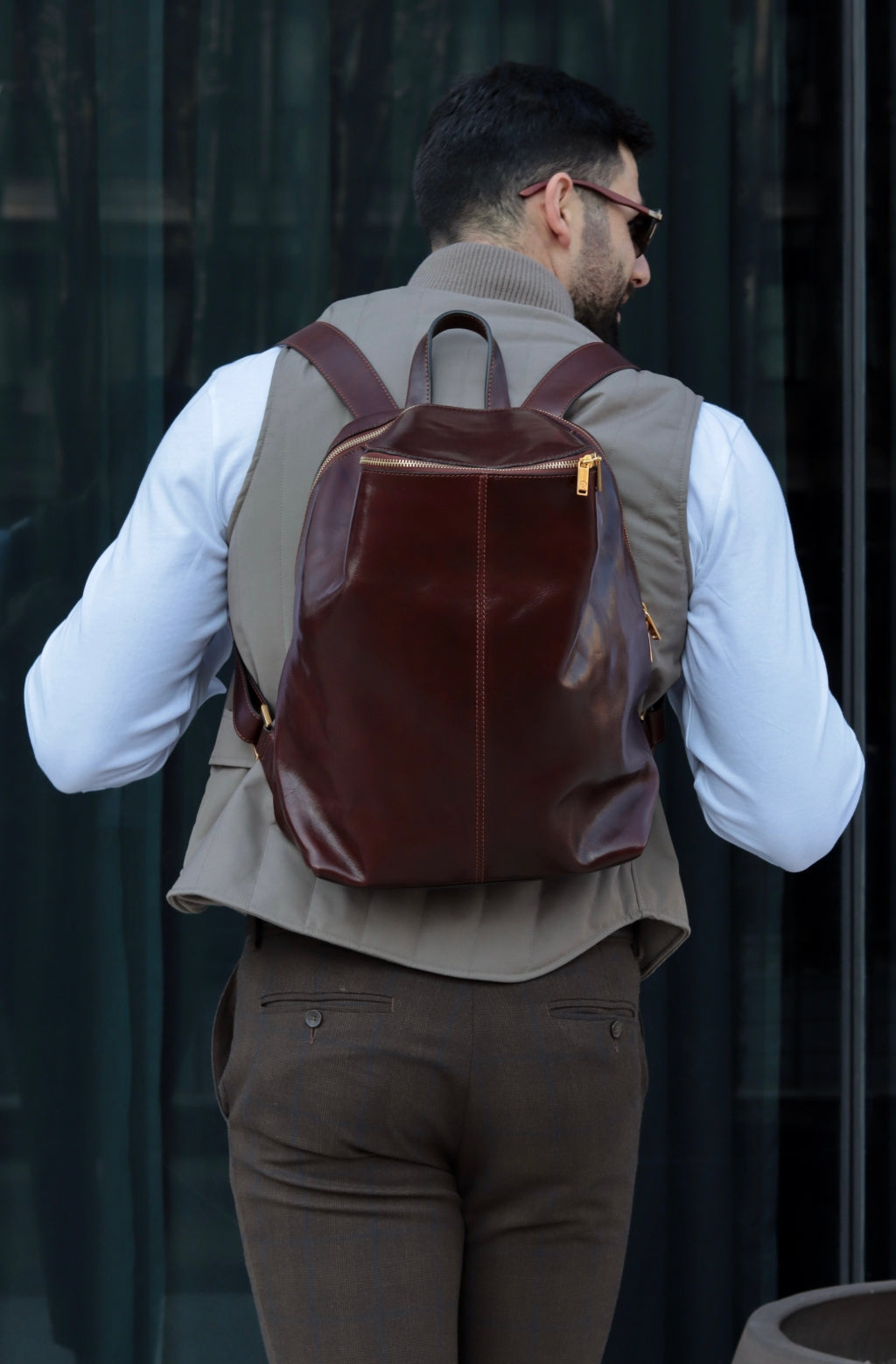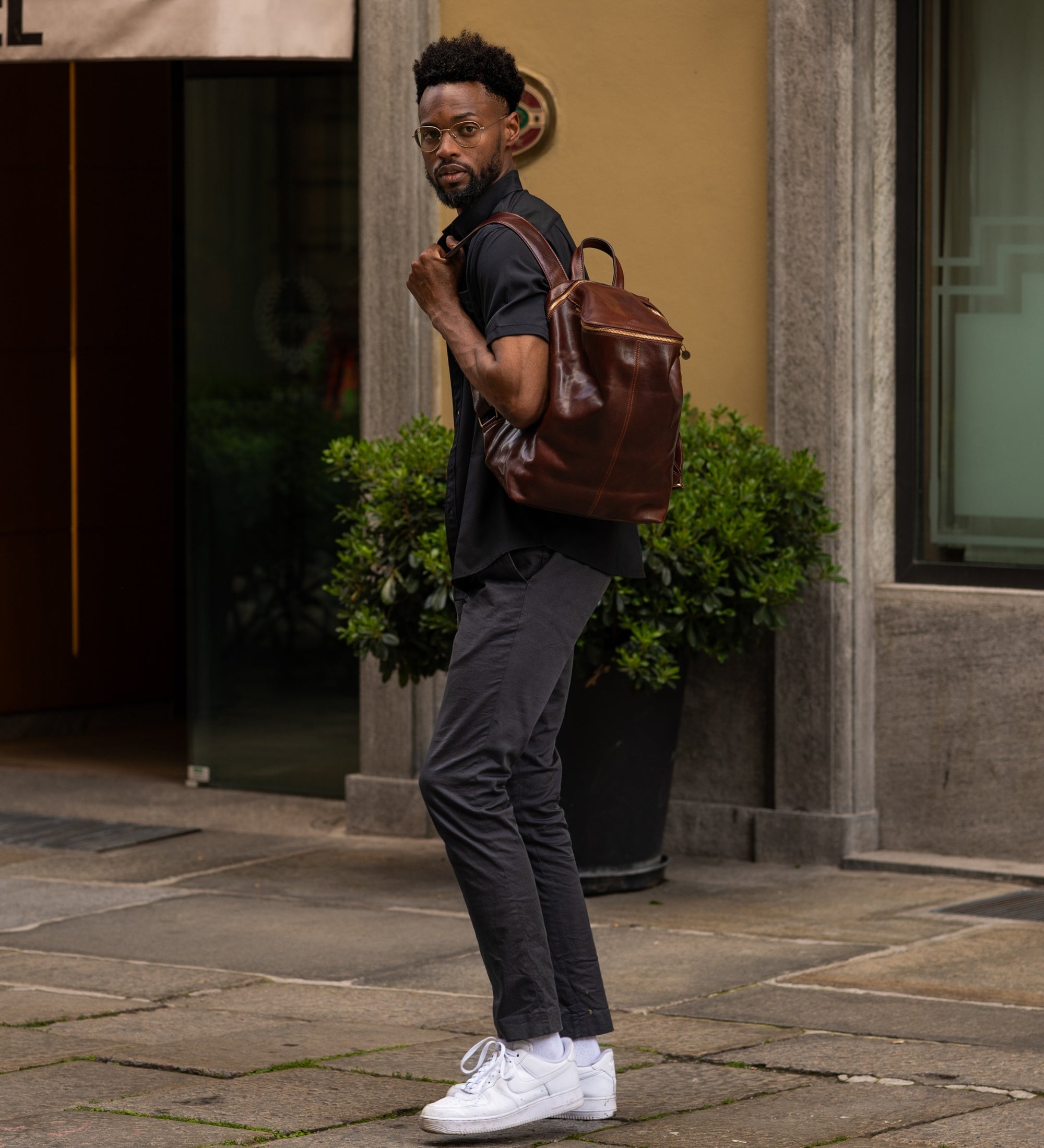 A unique Origami inspired Italian leather backpack A Bend in the River represents our vision in design and function: it is clean yet intricate. Born in the heart of Italy this full-grain leather beauty is a worthy contender in the backpack world. More function, more quality, more travel!
