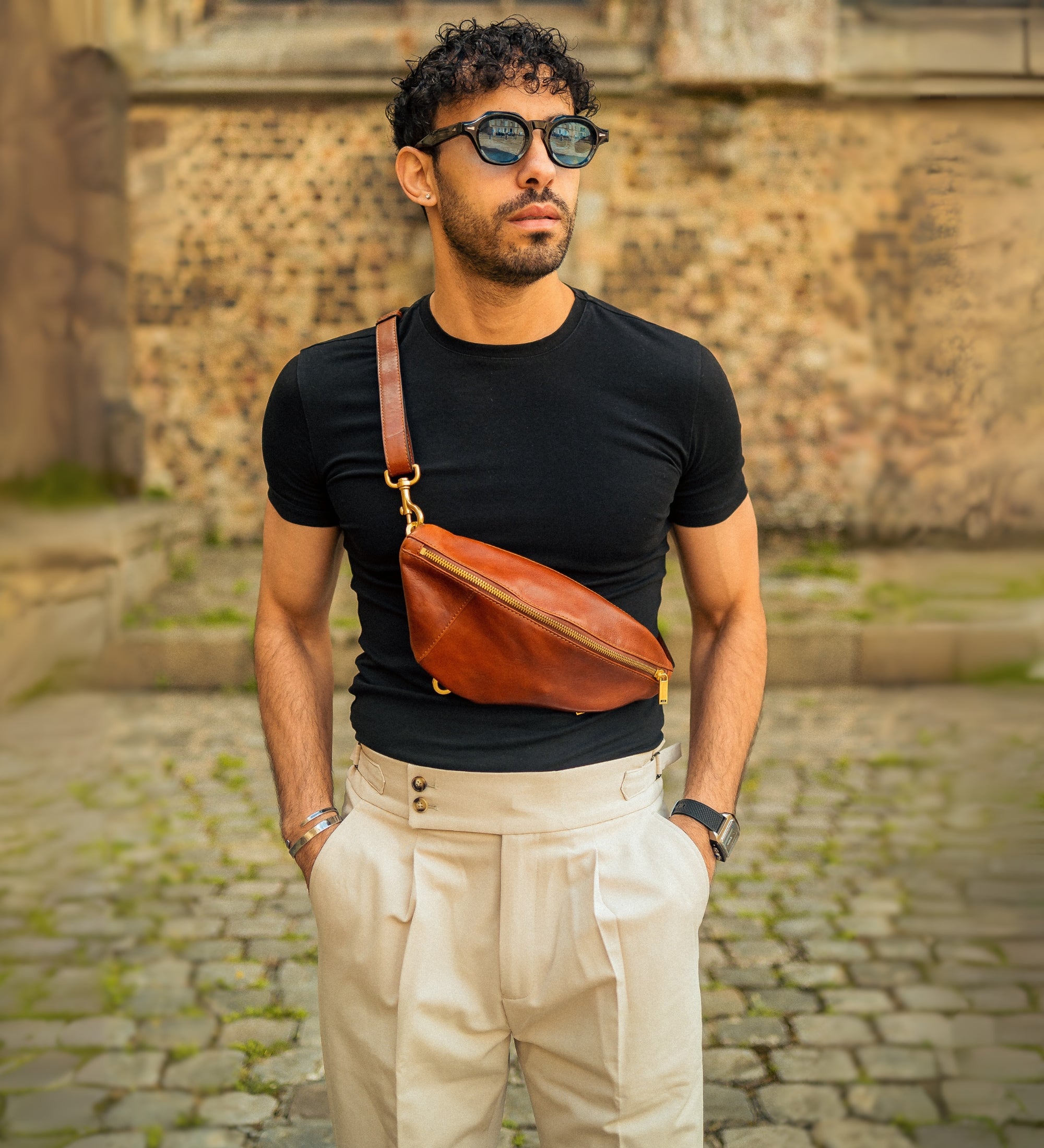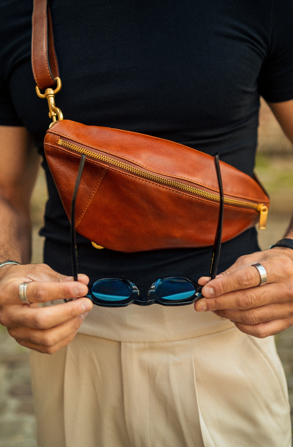 Introducing our leather sling bag Tales of the City quotes, a bold statement of individuality and contemporary flair. Its irregular triangle shape defies convention, with sharp, asymmetric corners that speak to the dynamic spirit of the modern explorer. As you sling it over your shoulder, you feel a surge of confidence and empowerment, knowing that you carry not just a bag, but a symbol of your unique perspective on life. Its minimalistic design exudes an air of effortless cool, while the adjustable strap offers versatility and adaptability to suit your every mood and movement. With zip pockets discreetly nestled within, this bag is not just a fashion statement, but a practical companion for urban adventures and spontaneous escapades. Wear it on your left or right side, embracing the freedom to express yourself however you choose. Embrace the unconventional with our leather chest bag, where style meets spontaneity in perfect harmony.