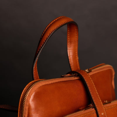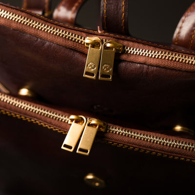 Time Resistance bags are crafted from premium full-grain, hand-dyed, vegetable-tanned Italian cowhide, known as Vachetta leather, which develops a beautiful patina.