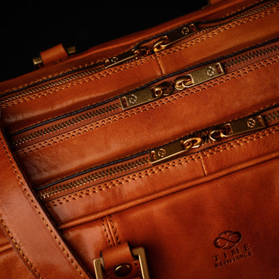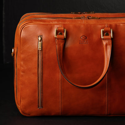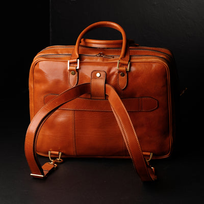 A spacious briefcase for a heavy traveler. This full-grain Italian leather work bag has three compartments and lots of pockets for all your belongings. Carry it in hand, wear it on your shoulder, convert it into a backpack, or use the trolley strap to carry it on a suitcase. Innovative design, premium hand-dyed leather, and clean lines reflect the purpose of this briefcase, which is to make things happen while in style.